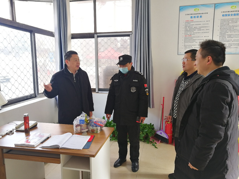 在新春佳节到来之际,2月12日大年初一上午,校党委书记、校长李虎在党办主任范次猛、安保处处长褚晓林等部门负责人的陪同下,分别对学校钱荣校区和锡澄校区在岗值班的教职工和保安进行走访慰问,送上校领导的关怀和温暖,并送上诚挚的新春祝福。