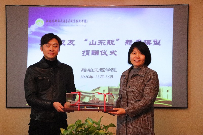 校友王浪向学院捐赠了“山东舰”航母模型,以激励广大船舶学子心怀祖国,发愤图强,成为祖国栋梁之才。