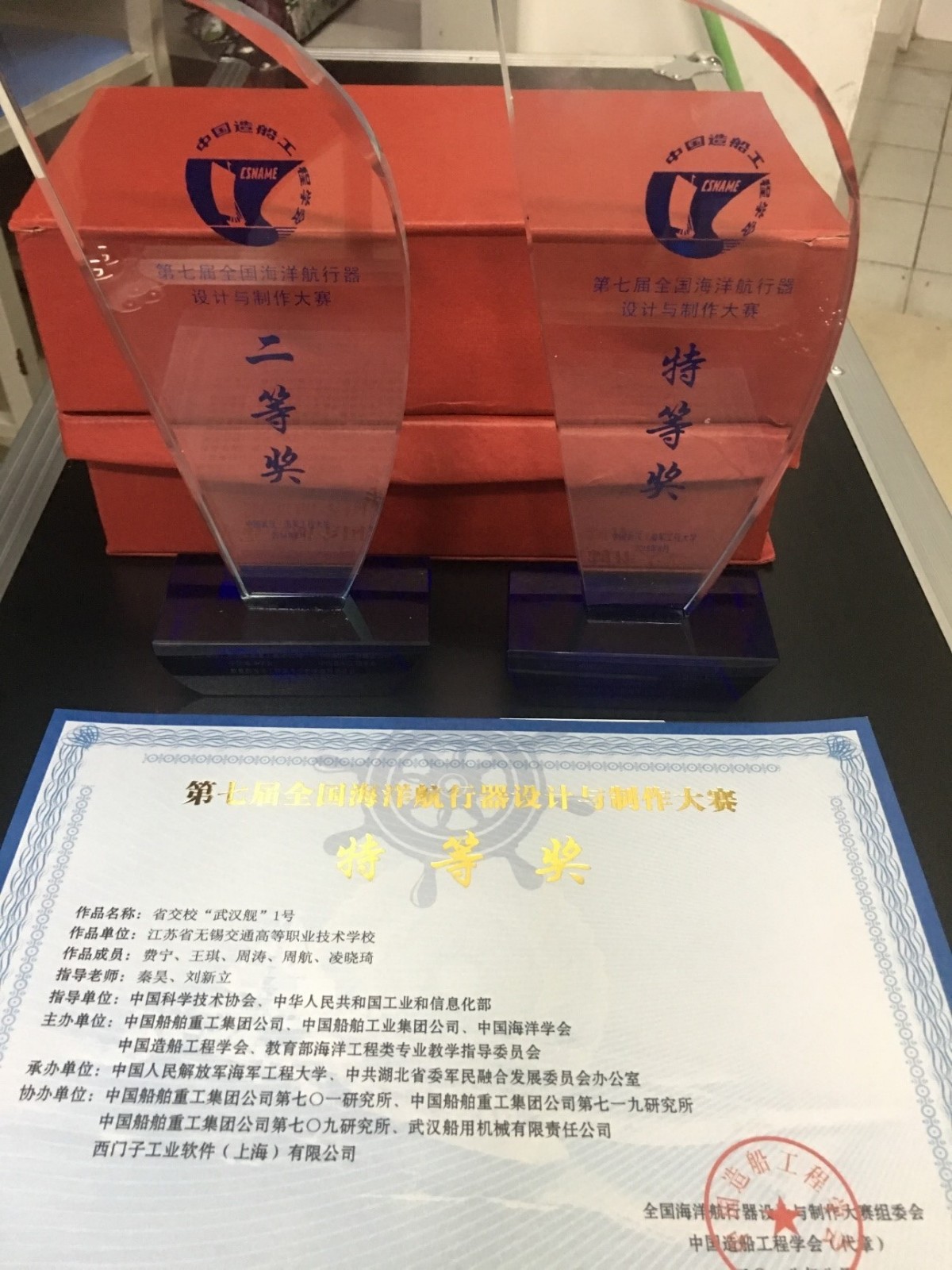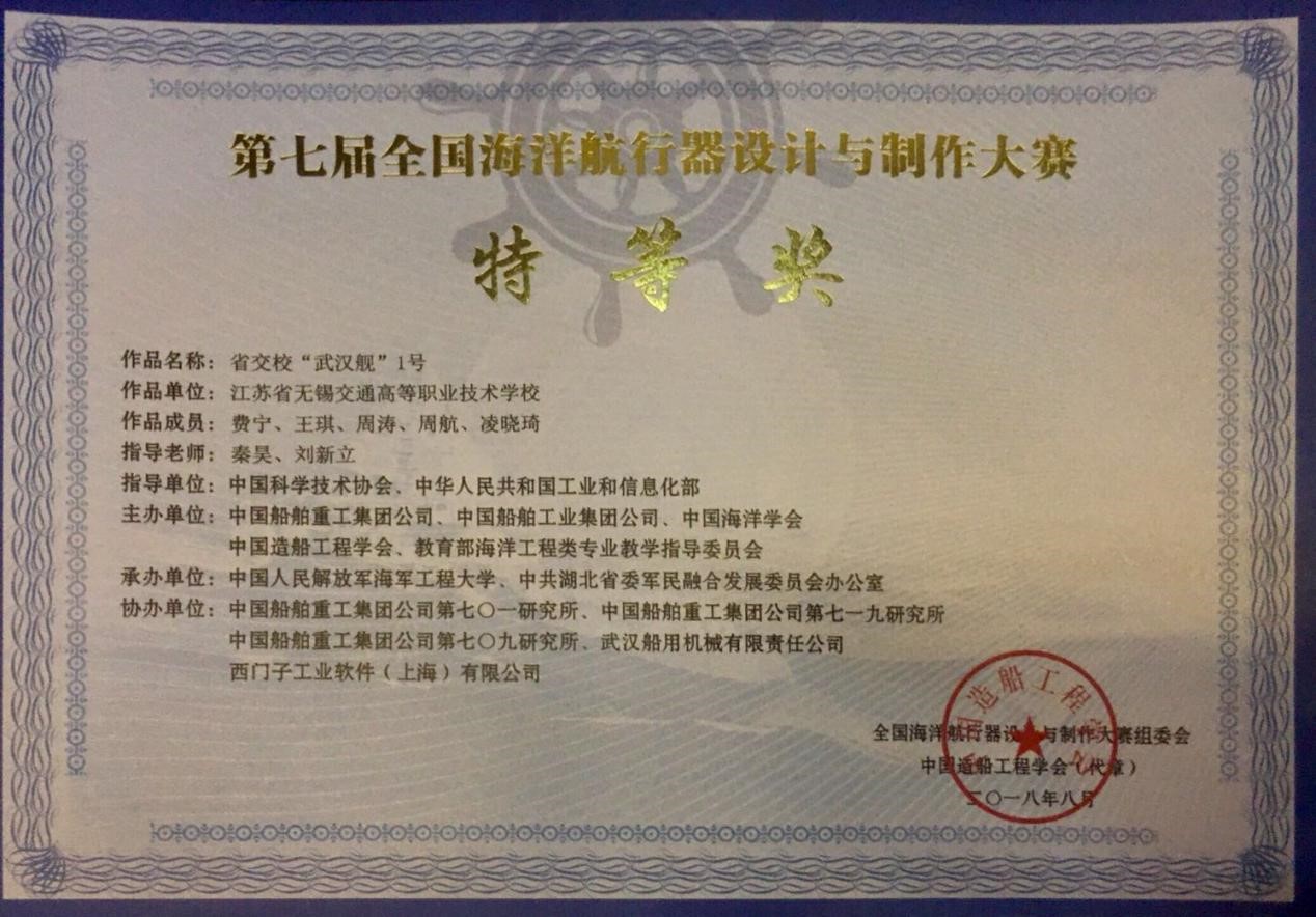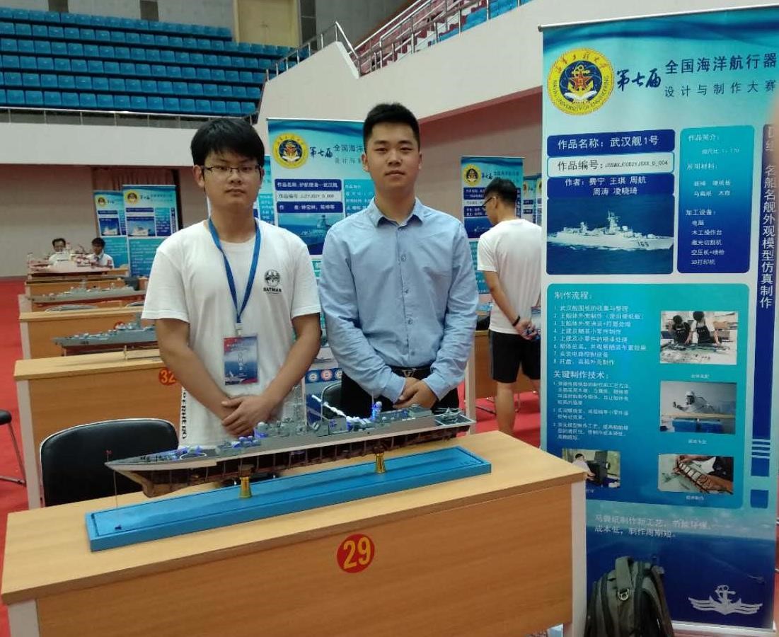 第七届全国海洋航行器设计与制作大赛于8月10日—8月12日在中国人民解放军海军工程大学隆重举行,来自上海交通大学、哈尔滨工业大学、华中科技大学、西北工业大学等全国51所院校的84件名船名舰模型仿真作品和94件船模竞速作品在海工大体育馆展开了评比,我校船舶工程学院深蓝社成员们经过三个月的精心制作,在原有的制作工艺上不断创新,突破制作技术上难点,经过了2天的评比筛选,我校名船名舰模型仿真作品“武汉舰”1号荣获了特等奖,“武汉舰”2号荣获了二等奖,船模竞速作品省交校1号荣获了能耗测试奖,经过这次比赛,学生们交流了制作心得,展示了制作水平,坚定信念,勇往直前,为学校在行业中赢得了良好的声誉。