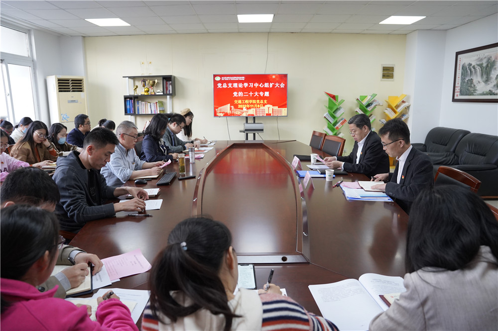 为深入学习宣传贯彻党的二十大精神,强化思想理论武装,按照学校党委统一部署,11月8日下午,交通工程学院党总支召开了主题为“深入学习宣传贯彻党的二十大精神 奋力谱写学校高质量发展新篇章”的理论学习中心组(扩大)学习会,学校巡学旁听组成员、学校党委书记、校长李虎出席会议并讲话。