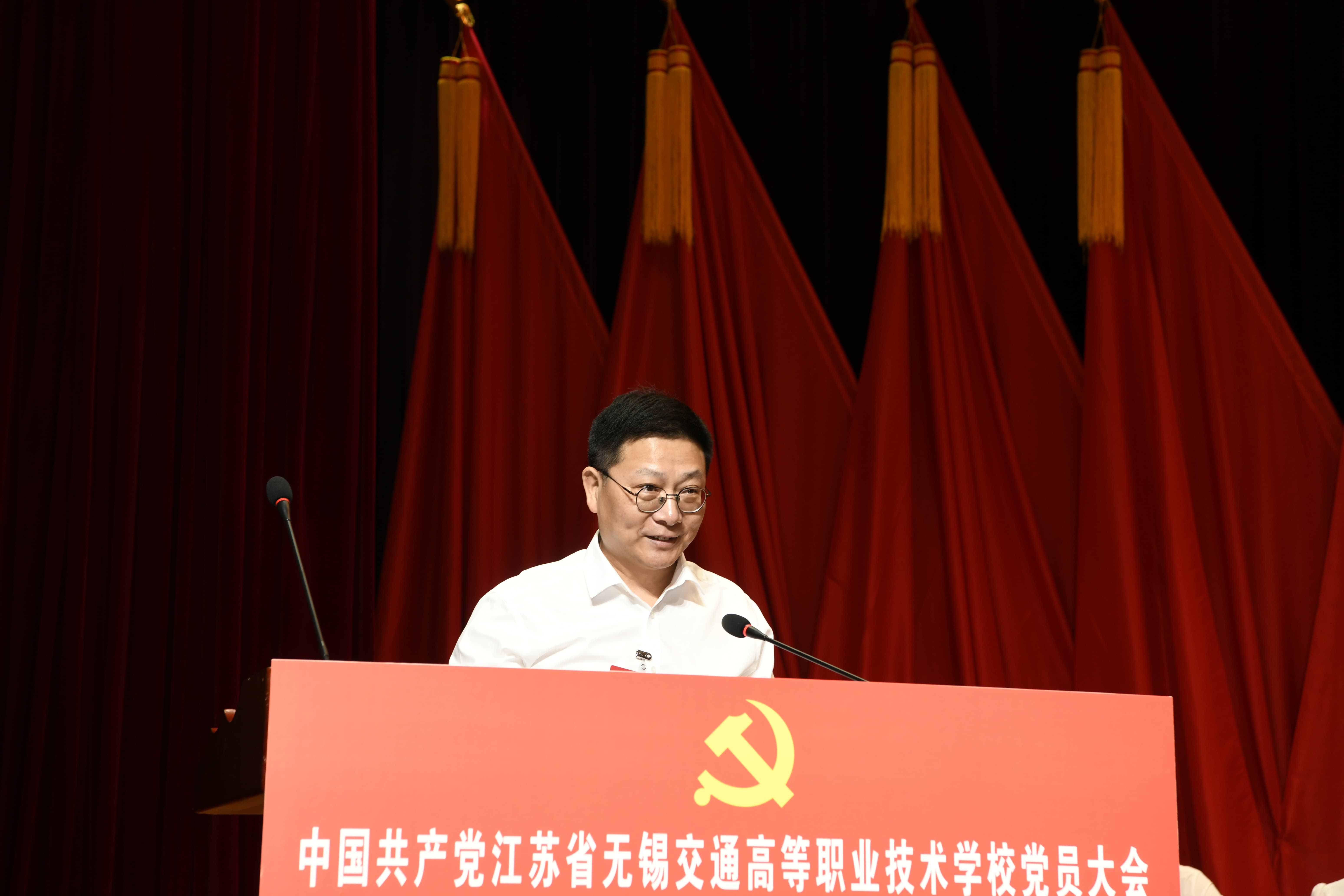 江苏省交通运输厅政治处处长、一级调研员金华对大会的召开表示热烈祝贺,向出席会议的全体人员致以诚挚的问候。他指出,2019年以来,学校党委在厅党组的坚强领导和无锡市委、市政府的关心支持下,坚持以习近平新时代中国特色社会主义思想为指导,认真履行管党治党、办学治校主体责任,全面贯彻党的教育方针,落实立德树人根本任务,充分发挥领导核心作用,持续深化教育教学改革,不断提升人才培养质量,为学校事业发展提供了坚强的政治保证和组织保证。他提出四点希望和要求:一是强化政治引领,坚定不移加强党的全面领导。二是聚焦立德树人,全面提高人才培养质量。三是坚持全面从严治党,营造风清气正的政治生态。四是加强领导班子建设,充分发挥事业领导核心作用。金华希望学校以本次党员大会为新的起点,深入学习贯彻习近平新时代中国特色社会主义思想,全面贯彻党的二十大和二十届二中、三中全会精神,全面落实省委、省政府决策部署,在厅党组的坚强领导下,在无锡市委、市政府的关心支持下,团结带领全体师生员工,不忘初心、牢记使命,踔厉奋发、勇毅前行,努力开创学校事业高质量发展新局面,为谱写“强富美高”新江苏现代化建设新篇章、为加快交通运输现代化示范区建设作出新的更大贡献!