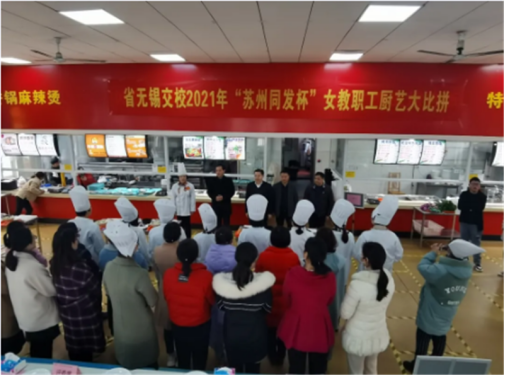 阳春三月,最美女神季。为了丰富女教职工的业余文化生活,3月12日,学校在一号食堂举办女神节系列活动——2021年“苏州同发杯”女教职工厨艺大比拼活动。学校党委书记、校长李虎亲临现场并宣布比赛正式开始,他还为参赛选手鼓舞助力。学校副校长、工会主席耿兴华变身“美食鉴定官”。