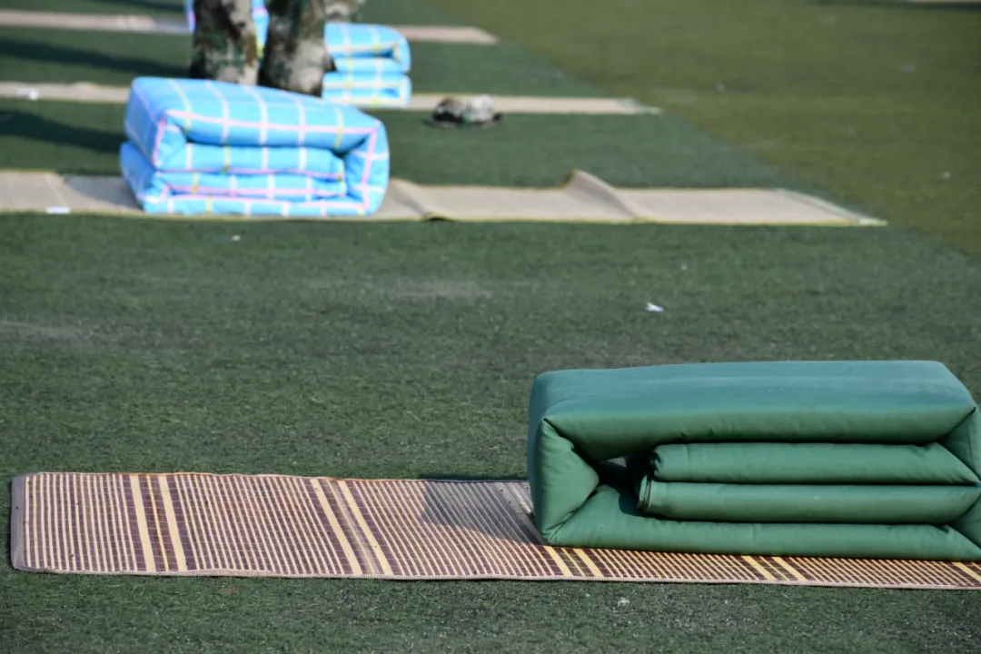 经过几天紧张的模拟训练,学生们都跃跃欲试,摩拳擦掌,一展风采。100名新生有序地来到操场,进行一场叠被子技能大比拼,伴随着口令,他们立即进入状态,迅速蹲下,铺平、压实、翻折、抠角、捏线,熟练地叠起被子,有的还以尺子予以辅助。