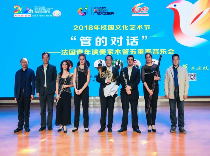 10月25日晚,参加第二十届中国上海国际艺术节的节目——“管的对话--法国青年演奏家木管五重奏音乐会”在我校大礼堂专场演出。无锡市文联葛建军秘书长、学校师生代表共700余人观看了此次演出。
