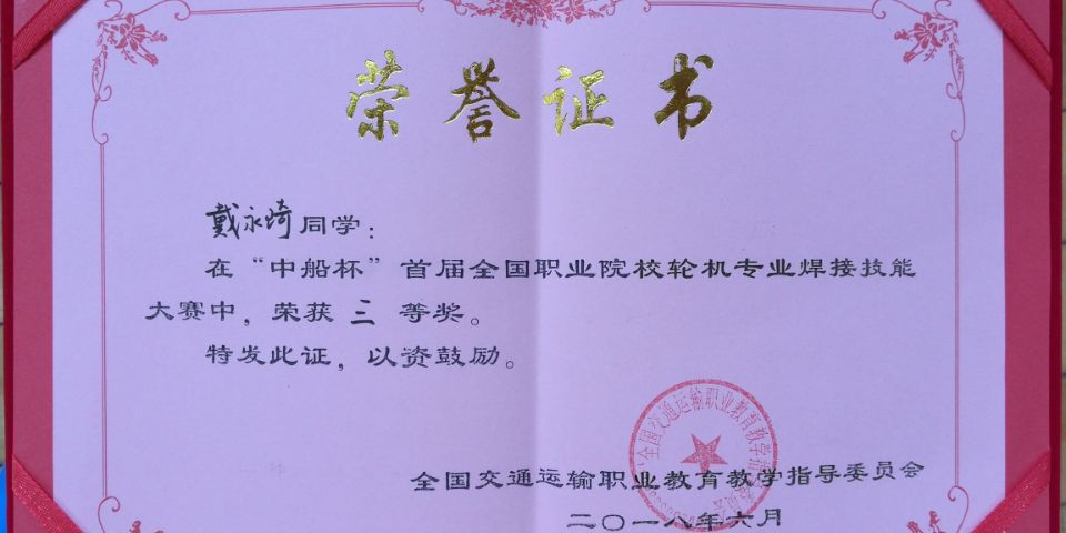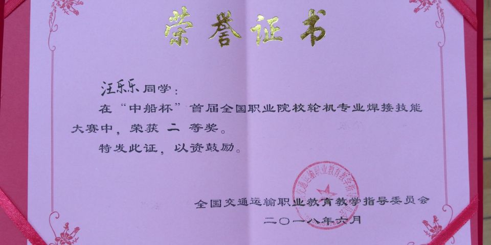 6月14日至16日,由全国交通运输职业教育教学指导委员会主办,全国交通行指委航海类专业指导委员会、全国航海职业教育集团和南通航运职业技术学院承办的“中船杯”首届全国职业院校轮机专业焊接技能大赛在南通航运职业技术学院举行。我校选手汪乐乐同学荣获二等奖、戴永琦同学荣获三等奖,学校荣获优秀组织奖。