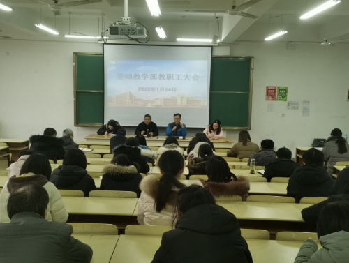 1月14日下午15:00,基础教学部在508阶梯教室召开全体教职工大会。学校党委委员、副校长耿兴华,基础教学部主任陈建明,基础教学部副主任许莹霞出席会议,会议由基础教学部党总支副书记杨凤琴主持。