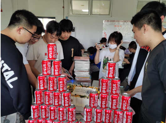 为了给同学们鼓励,郭晓琳为每位同学定制了三份礼物,一是专属可乐,在可乐瓶上留下对每位同学的祝福:如利剑出鞘、百炼成钢、马到功成、天道酬勤等;二是专属笔记本,郭晓琳提前在笔记本封面上设计了班级专属寄语。同时,郭晓琳还定制了一个集体大蛋糕,蛋糕上绘有班级对口升学的大学(南通理工学院)的校徽,并写有班主任的寄语“道阻且长,行则将至;行而不辍,未来可期”,勉励同学们克服惰性、加强自律,为实现大学梦为努力。