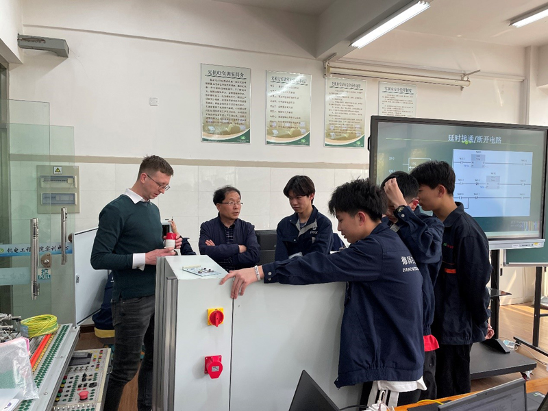 第一天的课程为陈静老师讲授的工业机电师吊桥装置(PLC编程技术)。课上,陈老师采用理实一体化教学方式教授学生如何编写PLC程序,并通过电机设备进行验证、调试。课后,外教与陈静老师进行了交流,同时,对学院中德实训室的建设提出了宝贵的建议。