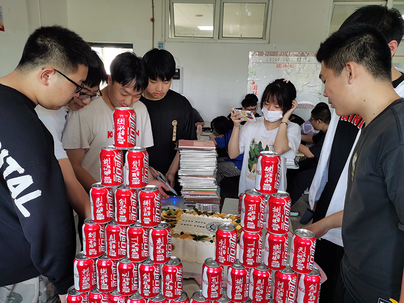 为了给同学们鼓励,班主任为每位同学定制了三份礼物,一是专属可乐,在可乐瓶上留下对每位同学的祝福:如利剑出鞘、百炼成钢、马到功成、天道酬勤等;二是专属笔记本,班主任提前在笔记本封面上设计了班级专属寄语。同时,班主任还定制了一个集体大蛋糕,蛋糕上绘有班级对口升学的大学(南通理工学院)的校徽,并写有班主任的寄语“道阻且长,行则将至;行而不辍,未来可期”,勉励同学们克服惰性、加强自律,为实现大学梦为努力。