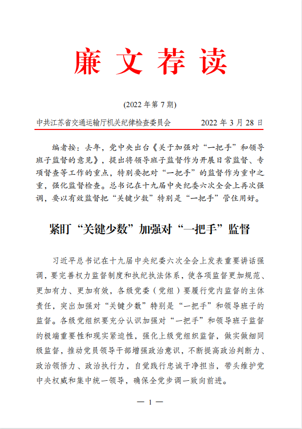 2022年廉文荐读第7期——紧盯“关键少数”加强对“一把手”监督