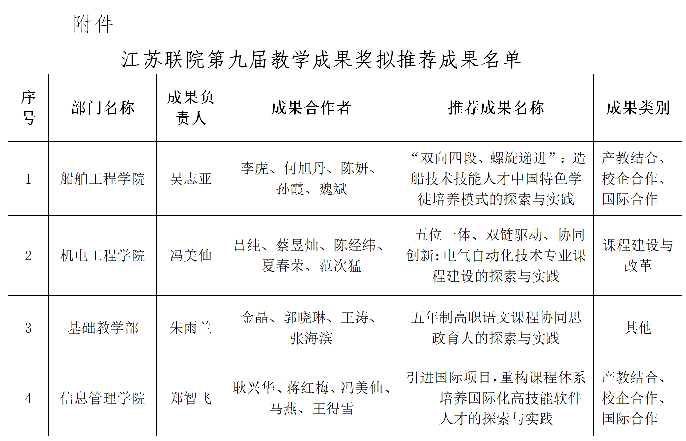 根据江苏联合职业技术学院《关于开展学院第九届教学成果奖评选工作的通知》(苏联院研[2023]2号)和学校《关于开展2023年度教学成果奖评选工作的通知》,学校组织了评选工作。在个人申报、院部遴选推荐的基础上,根据学校《教学成果奖评选办法》,组织教学工作委员会委员代表对申报材料进行了评审并报校领导研究,拟推荐《“双向四段、螺旋递进”:造船技术技能人才中国特色学徒培养模式的探索与实践》等四项成果参加江苏联院第九届教学成果奖的评比,现予以公示。公示期为6月10日至6月14日,在公示期内如对推荐结果有异议,请向教务处反映,电话68781132。