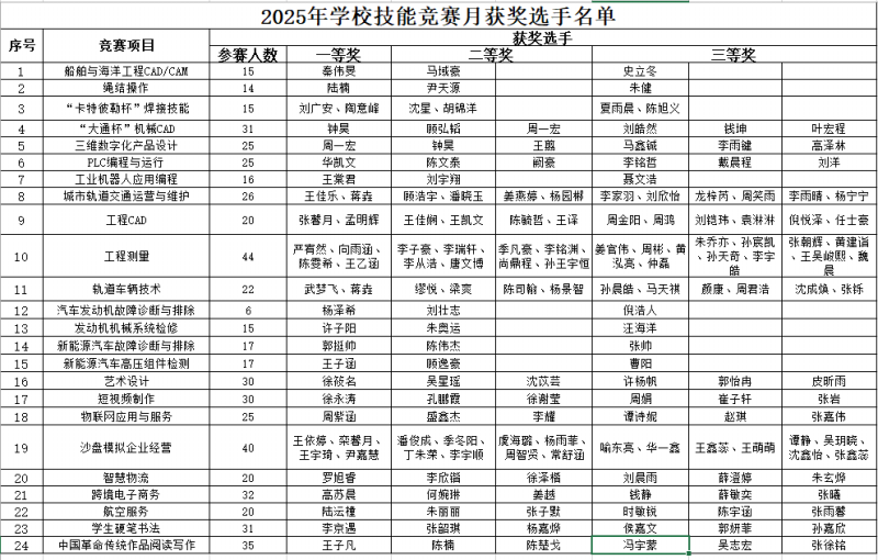 根据《关于开展2025年学校技能竞赛月活动的通知》,学校于2025年5月19日至5月23日,共有571名学生参加24个赛项比赛。经过各竞赛项目裁判认真评审,拟评出学生个人一等奖34个、二等奖59个、三等奖80个,优秀指导教师24名 。