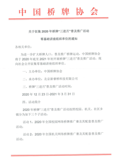 为进一步扩大桥牌人口,普及推广桥牌运动,中国桥牌协会组织开展了桥牌进校园、进机关、进社区的桥牌“三进月”普及推广活动,我校成功入选全国校园网络桥牌推广活动组织单位。