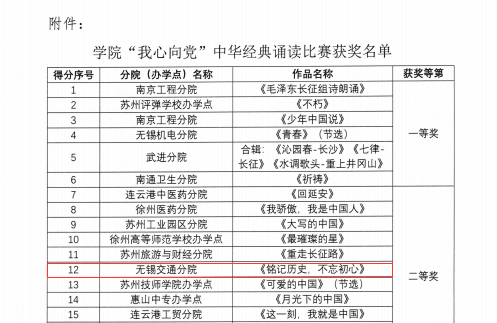 为弘扬中华优秀语言文化,歌颂建党百年光辉历程,彰显举世瞩目伟大成就,增强爱党爱国情怀。江苏联合职业技术学院开展了“我心向党”中华经典诵读比赛活动,根据《关于公布学院“我心向党”中华经典诵读比赛获奖名单通知》,我校节目《铭记历史 不忘初心》荣获二等奖。