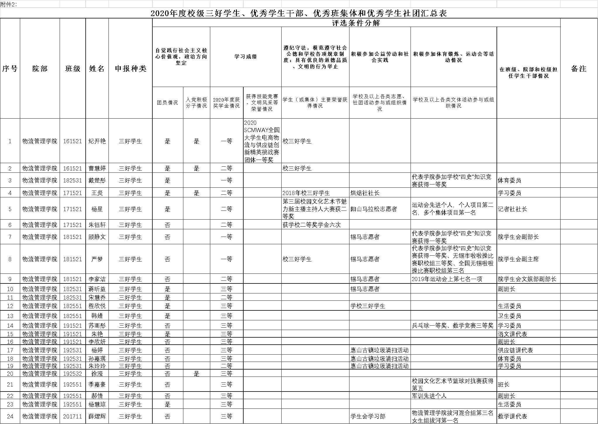 根据学生工作处下发的《关于开展2020年度校级三好学生、优秀学生干部、先进班集体、优秀学生社团等荣誉评选表彰活动的通知》文件要求,认真研究文件精神,召开班主任会议进行传达,班主任根据文件精神在班内进行宣讲,组织学生进行个人申报,班主任进行把关,然后上报院部,院部召开党政联席会议进行审核,最终公示如下: