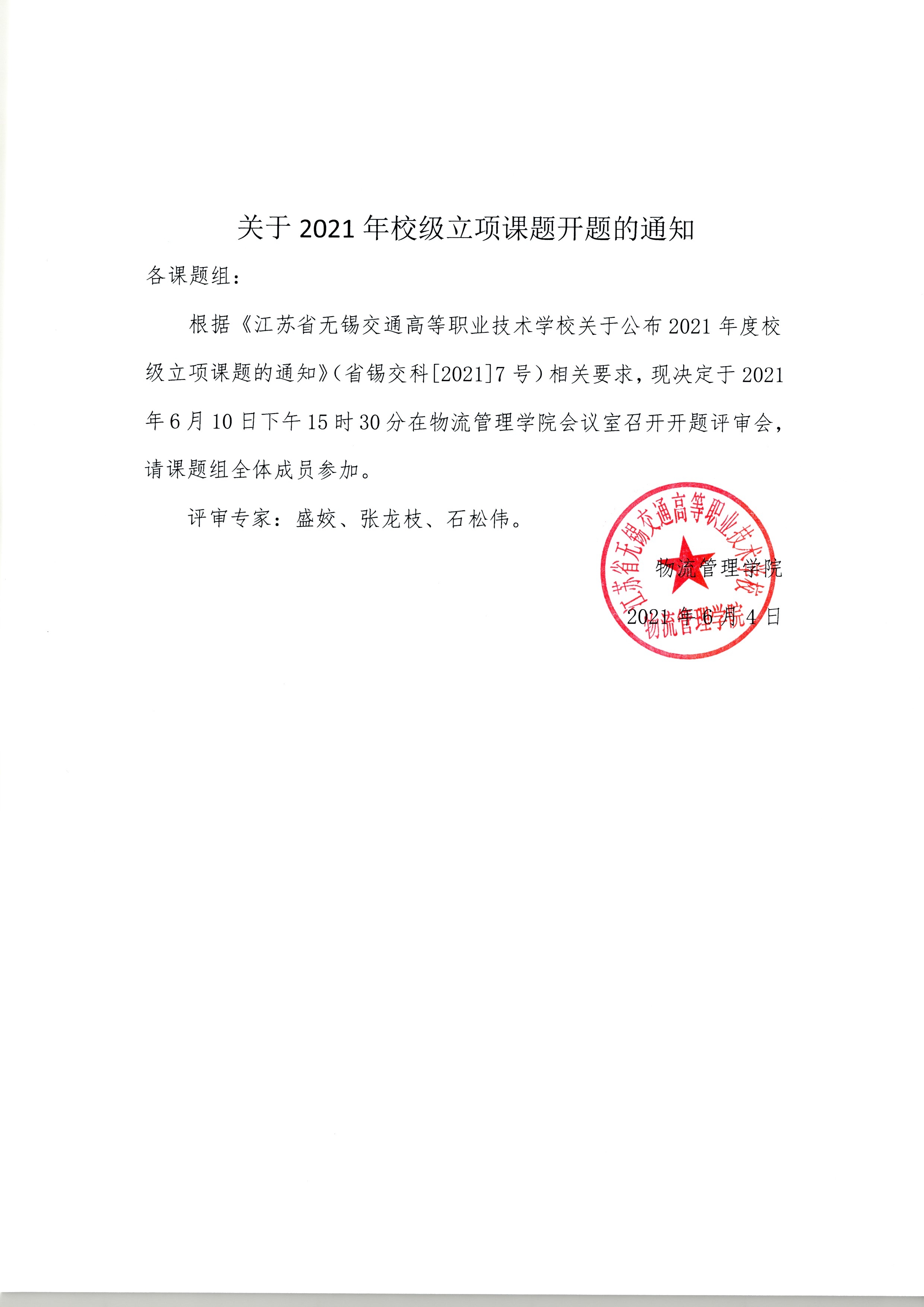 根据《MILAN.COM关于公布2021年度校级立项课题的通知》(省锡交科[2021]7号)相关要求,现决定于2021年6月10日下午15时30分在物流管理学院会议室召开开题评审会,请课题组全体成员参加。