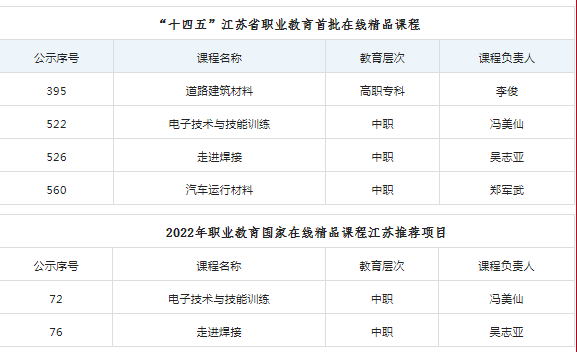 近日,江苏省教育厅公示了“十四五”江苏省职业教育首批在线精品课程及2022年职业教育国家在线精品课程江苏推荐项目,学校《道路建筑材料》《电子技术与技能训练》《走进焊接》《汽车运行材料》等4门课程被认定为“十四五”江苏省职业教育首批在线精品课程,其中《电子技术与技能训练》《走进焊接》被认定为2022年职业教育国家在线精品课程江苏推荐项目。