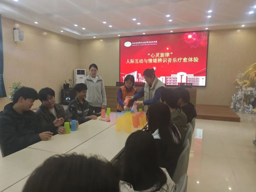 11月20日,学校邀请无锡市精神卫生中心谌利民主任和张一楠音乐治疗师团队,为同学们带来一场“心灵旋律”人际互动与情绪辨识疗愈体验活动。 活动伊始,张一楠老师通过播放轻柔的音乐,引导同学们深呼吸,放松身心。接着引导同学们在不同风格的音乐中画出自己的情绪体验。随着一曲悠扬的古典音乐缓缓响起,学生们纷纷拿起画笔,在画纸上勾勒出一幅幅宁静致远的画面,仿佛能透过音符感受到那份深邃与平和。紧接着,节奏明快、充满动感的流行音乐响起,学生们的画风也随之转变,画面上充满了活力与激情,色彩斑斓,动感十足。“杯子打击乐”环节,他们将手中的杯子变成了独特的乐器,演奏出了一段段富有节奏感的旋律。有的同学还加入了拍手、踏步等动作,使得整个表演更加生动有趣。 在此次活动中,同学们释放了学习压力,增强了团队协作精神和创新意识。同时,活动也为学校心理健康教育工作拓展了新思路和方法。