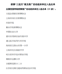 为进一步扩大桥牌人口,普及推广桥牌运动,中国桥牌协会组织开展了桥牌进校园、进机关、进社区的桥牌“三进月”普及推广活动,我校成功入选全国校园网络桥牌推广活动组织单位。