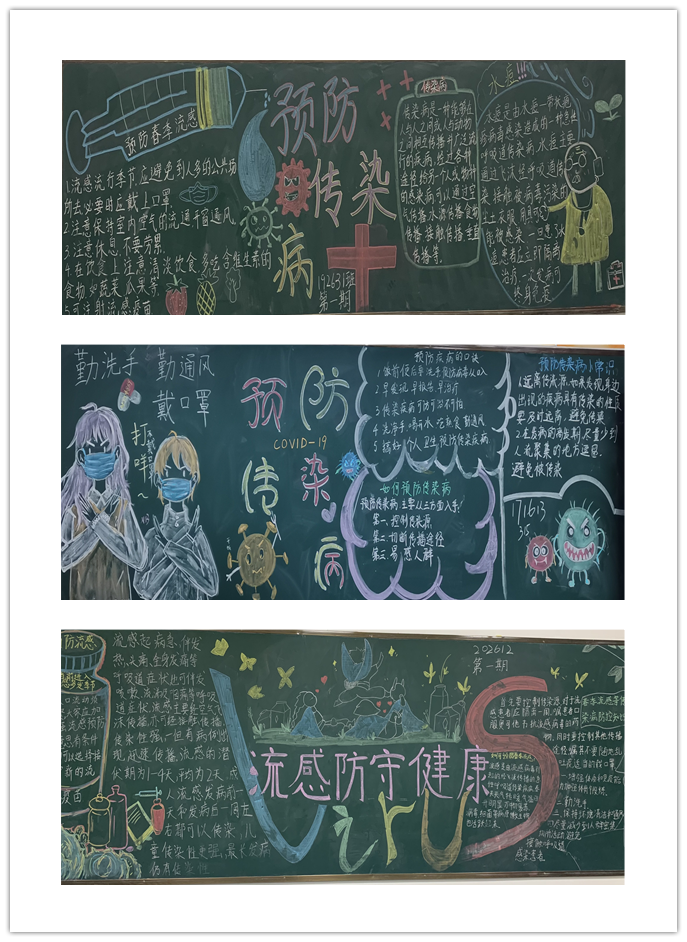 活动期间各班积极参与,黑板报设计精美、预防流感传染病知识内容丰富。通过黑板报的宣传,学生们对流感有了充分的认识,各班立即行动起来,勤洗手、勤开窗户、勤通风换气,发现咳嗽、打喷嚏等呼吸道感染症状及时就医。在学院营造了“预防流感”的良好氛围,对提高师生的自我保护意识和防病能力具有重要意义。