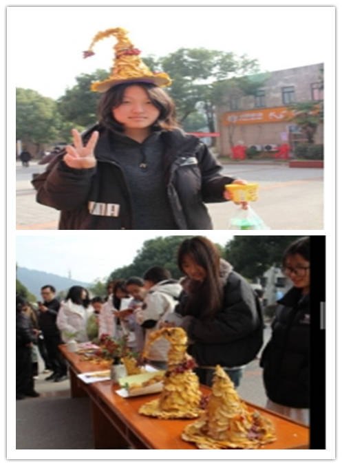 活动缘起于一次日常劳动教育的 “意外发现”。在校园落叶清扫任务中,241612班同学们被形态各异、色彩斑斓的秋叶吸引,萌生了创意改造的想法。全班迅速行动,将清扫的银杏叶、枫叶、梧桐叶等按树种、颜色分类收集,利用自习课以6人小组为单位开启创作。同学们充分发挥专业优势,将自然之美与巧思创意结合:扇形银杏叶拼接成 “魔法帽”“度假帽”,落叶组合成雅致花束,拼贴画勾勒出秋日校园的唯美意境,一件件文创作品充满巧思与温度。创作过程中,同学们沉浸式感受自然馈赠,在分工协作中收获成长。大家纷纷表示,相比碎片化的手机娱乐,亲身触摸自然、动手创造的过程更具意义——不仅锤炼了劳动技能、提升了审美素养,更树立了尊重自然、珍惜资源的生态理念,深刻体会到团队协作与自主创新的价值,让课程思政内涵在实践中落地生根。