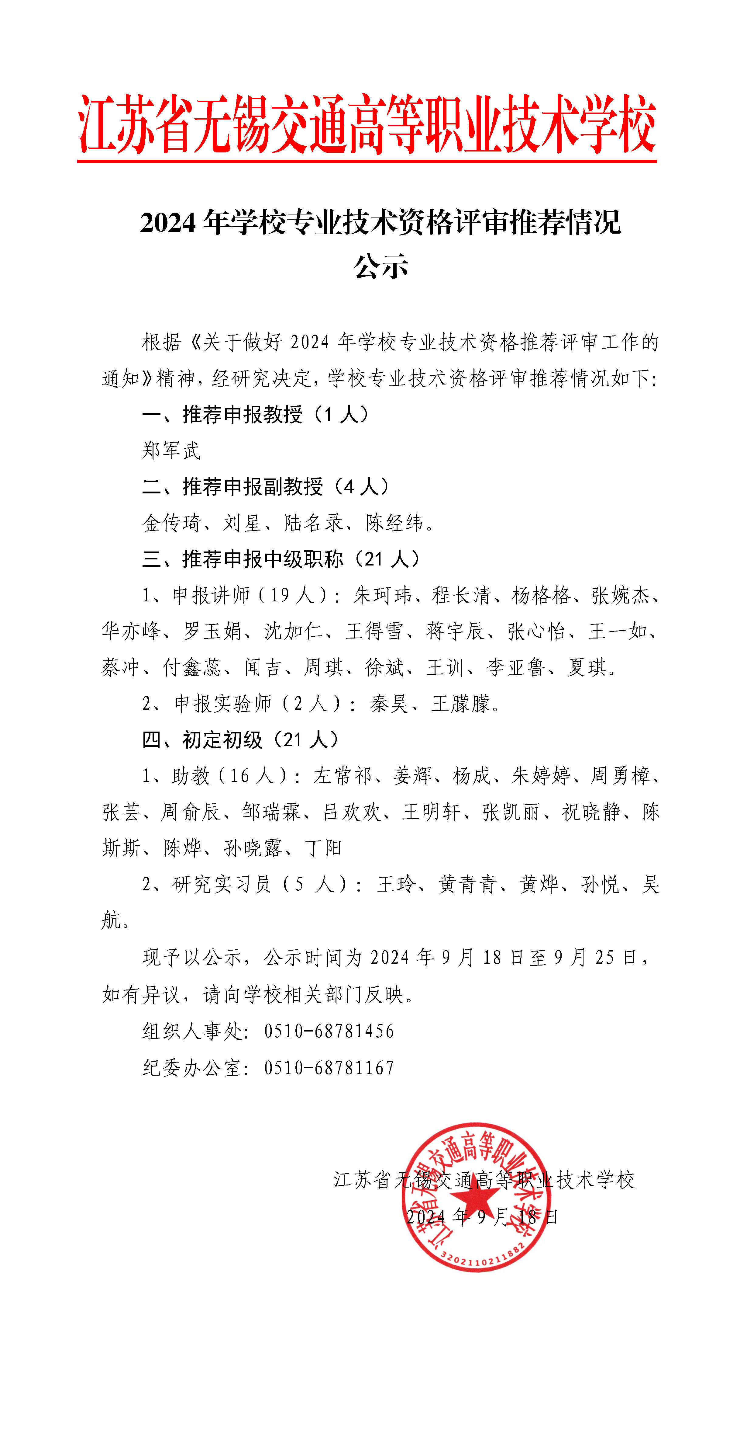 2024年学校专业技术资格评审推荐情况公示