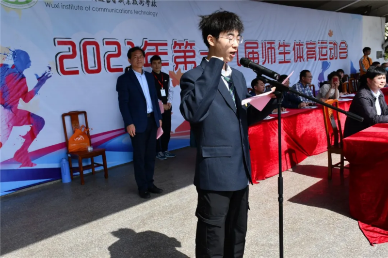 裁判员代表夏琪老师和学生代表唐家航进行宣誓:公平公正守秩序,坚持友谊第一,比赛第二的体育风尚,以顽强拼搏的精神,为运动会添彩!