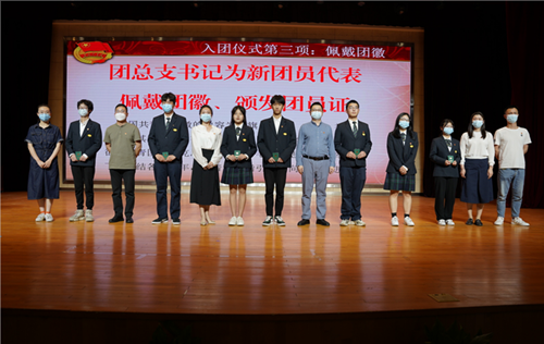 活动在庄严的国歌声中拉开帷幕。入团仪式上,各学院团总支书记为新团员代表颁发团员证,佩戴团徽,并组织老团员重温入团誓词,新团员进行入团宣誓,全体人员共同接受了一次思想的升华和心灵的洗礼。新团员吴沁尧同学、老团员李丹凤同学作为代表发言,她们均表示要紧跟习近平总书记“把青春献给祖国”的号召,坚定不移的高举团旗跟党走。不负韶华、不负时代、不负人民,敢闯、敢干,以青年人的拼搏努力,来践行“请党放心,强国有我”的铮铮誓言。