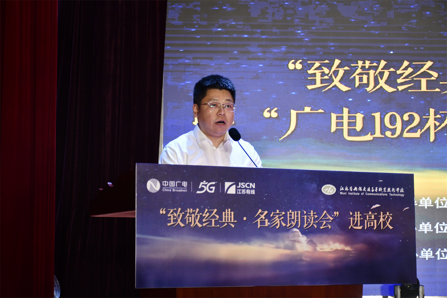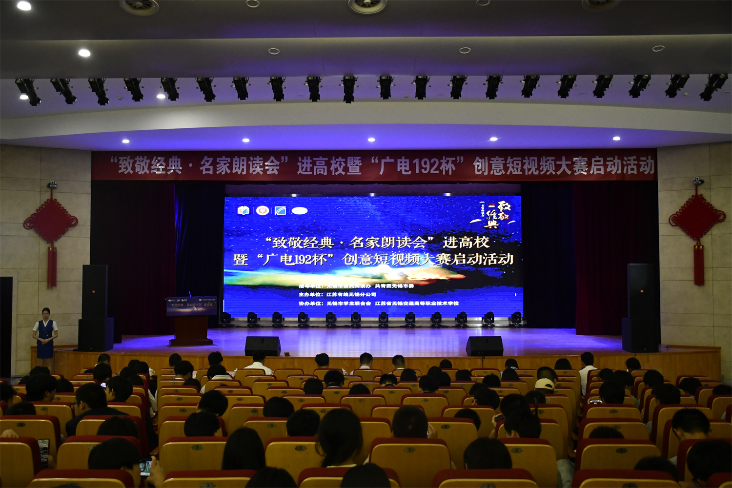 6月5日下午,一场别开生面的文化盛宴在学校大礼堂拉开帷幕。由江苏有线无锡分公司主办,无锡市学生联合会、MILAN.COM联合承办的“致敬经典·名家朗读会”进高校暨“广电192杯”创意短视频大赛启动活动在此成功举办。无锡市委宣传部出版印刷发行处副处长冯健,共青团无锡市委学少部副部长王裔,江苏有线无锡分公司党委委员、副总经理赵晓光,校党委委员、副校长耿兴华、王珏及在锡高校领导代表、江苏有线无锡分公司代表、我校师生代表600余人共同参加了本次活动。
