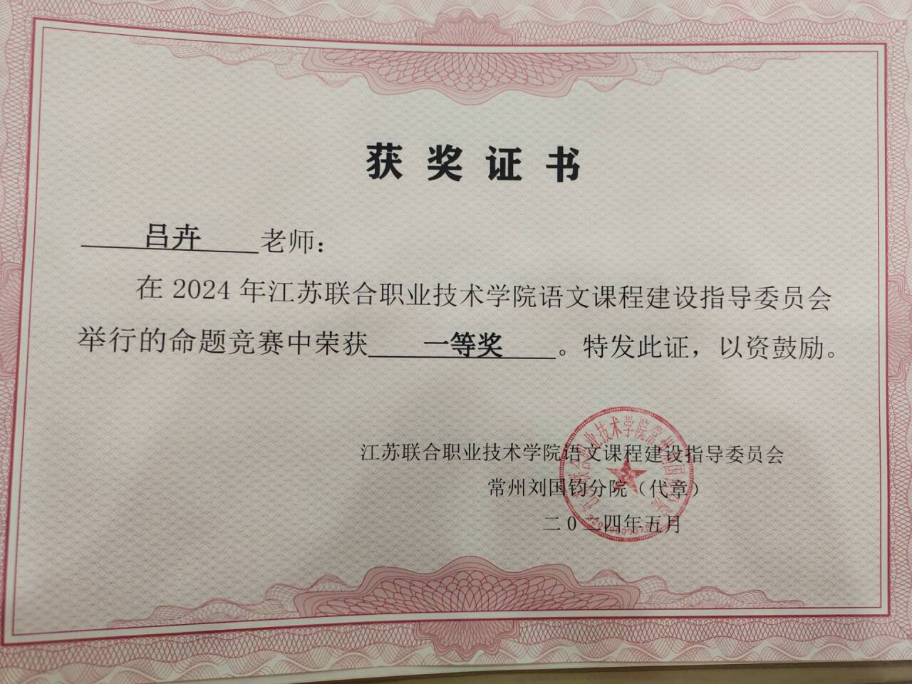 近日,江苏联合职业技术学院公布了五年制高职语文命题竞赛的获奖名单。该竞赛面向学院五年制高职在职语文教师,旨在推进《五年制高等职业教育语文课程标准》的贯彻和运用,推动五年制高职语文课程建设。我校基础教学部语文教师吕卉、郭晓琳分获一、二等奖。