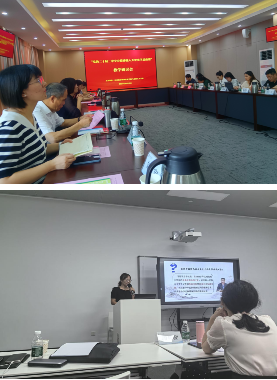 江南大学马克思主义学院副院长唐忠宝及中国矿业大学马克思主义学院党委书记阎国华参加了会议,分别以“‘中国式现代化’如何在大中小学思政课中讲深讲透将活”与“党的二十届三中全会精神融入大中小学思政课的内容维度与实践向度”为主题作报告,来自江苏信息职业技术学院等九个院校的教师进行了教学展示。