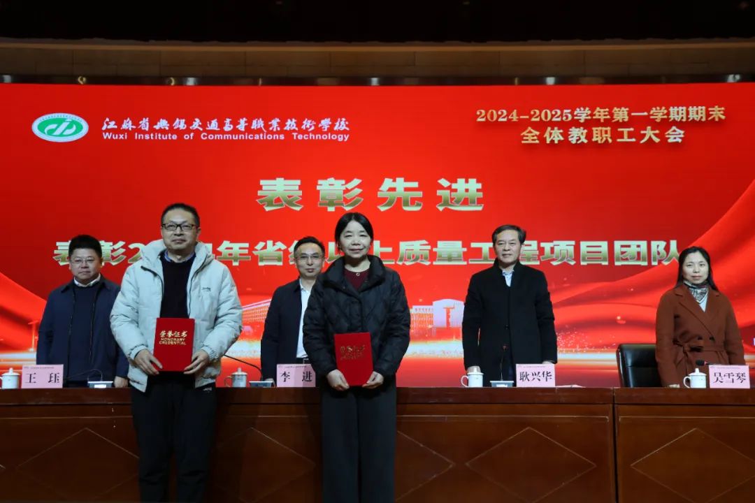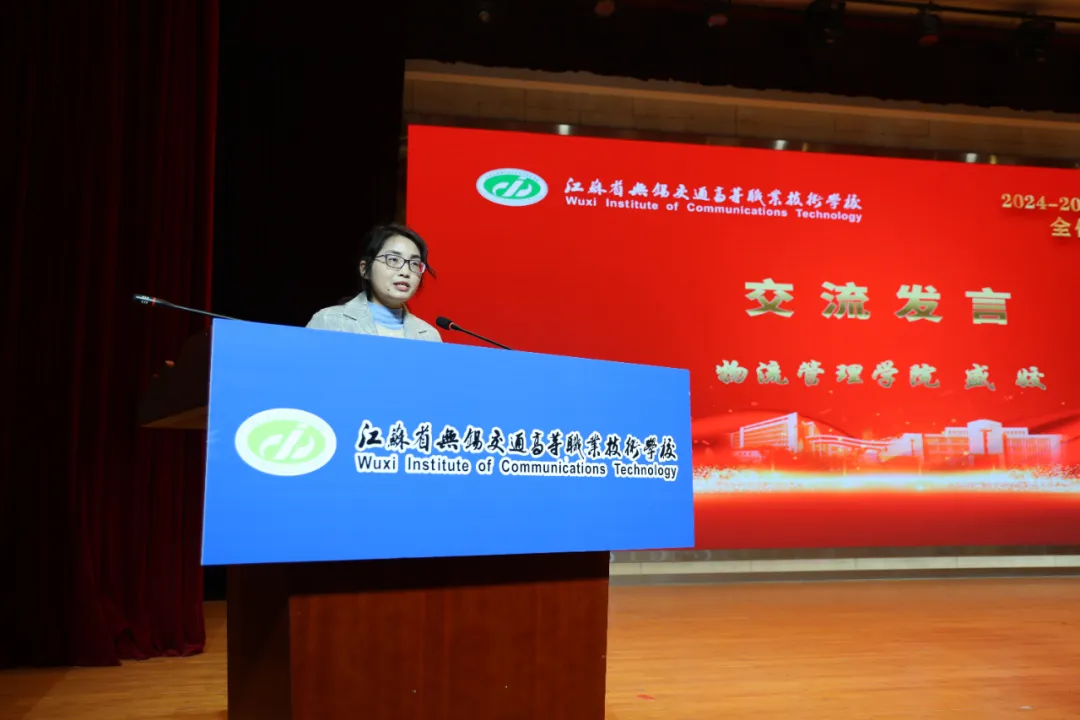 学校党委委员、副校长吴雪琴宣读2024年学校“十件大事”。全面回顾了学校在过去一年的奋斗足迹。会上还表彰了省级以上荣誉获奖教师和团队。校领导为他们颁发获奖证书和铜牌。来自处室、学院的优秀教职工代表作交流发言,分享了在专业建设、技能竞赛以及工作中的优秀经验和做法。