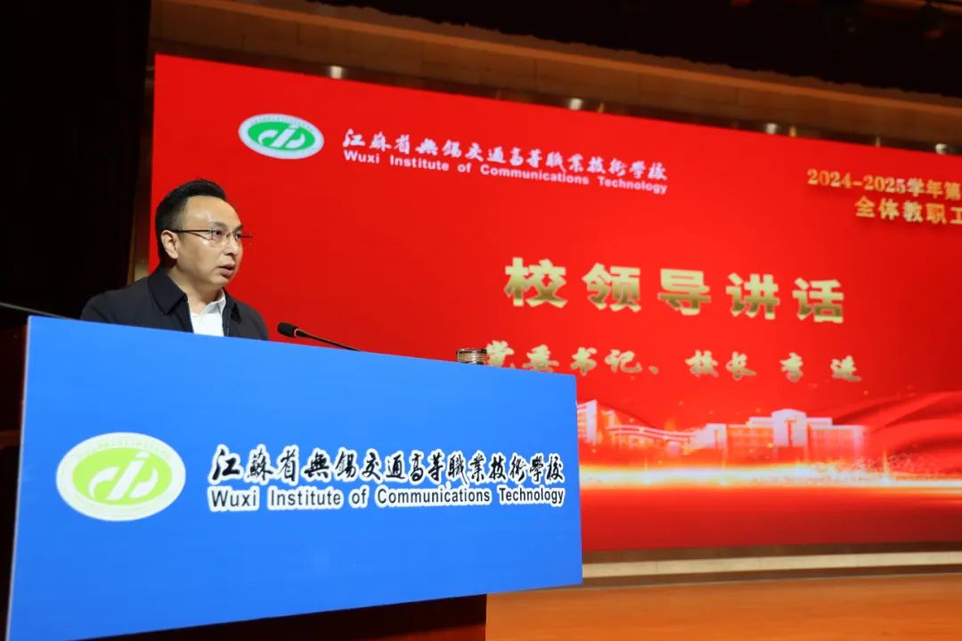 学校党委书记、校长李进讲话。2024年,学校坚持党的全面领导,全面提升教育教学质量,全力促进产教深度融合,全面提升铸魂育人实效,坚决筑牢校园安全稳定防线,统筹推进新校区建设,学校高质量发展取得新成效。他展望了2025年的工作,希望全体教职工在新的征程中凝心聚力、踔厉奋发,为学校的持续发展不懈努力,共同书写教育事业的新篇章。