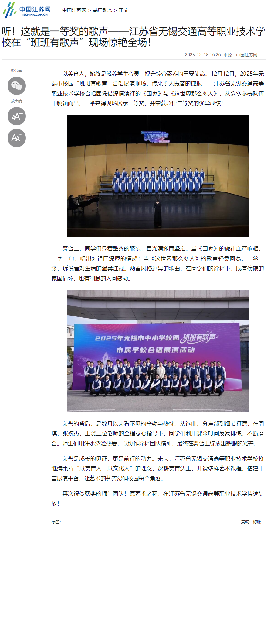 学校在2025年无锡市校园“班班有歌声”合唱展演中获一等奖