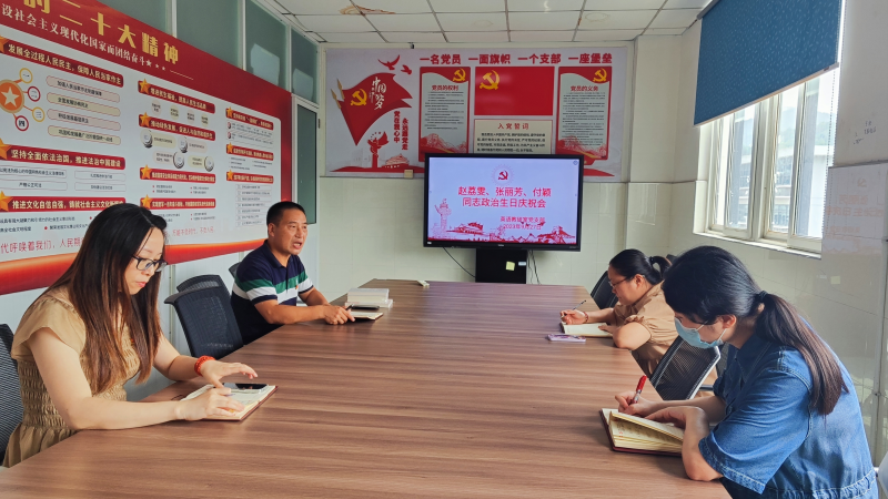 2023年9月27日下午,英语教研室党支部全体党员在部门会议室为赵荔雯、张丽芳、付颖三位党员同志庆祝“政治生日”。