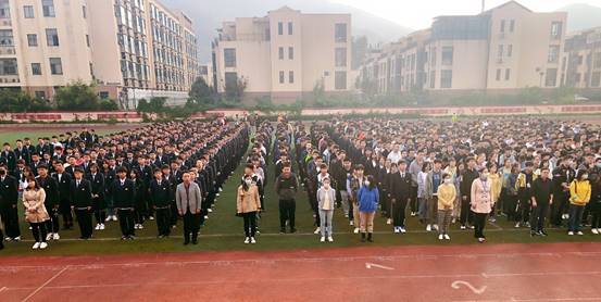在全体师生的注目礼下,国旗护卫队迈着铿锵有力的步伐护送鲜艳的五星红旗进场,伴随着雄壮的《中华人民共和国国歌》,五星红旗冉冉升起,迎风飘扬。在场的每一个人向国旗唱国歌、行注目礼,深怀对祖国无限的热爱和崇高的敬意。