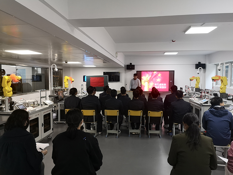在活动中,华亦峰老师向学生们教授了发那科工业机器人轨迹模块实训,通过讲授右手定则让学生们学会了如何确定工作台的运动方向,并且通过对具体操作流程的详细讲解,教授学生们如何操作工业机器人进行定点并运用线性运动的L指令绘制五角星。在课堂中,华老师灵活融入思政元素,增植学生们的爱国主义情怀,强调人生定位和规划对自身发展的重要性,以及精益求精的工匠精神对未来的学习和工作的重要性。