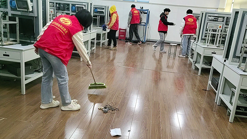 活动现场,志愿者们分工明确,密切配合。他们有的清扫实训室内的垃圾,有的擦拭玻璃窗的灰尘和杂物,还有的则忙着整理实验用具。尽管阳光照射下的气温已经开始升高,但志愿者们的热情却丝毫未减。他们的身影在春风中穿梭,成为了校园里一道美丽的风景线。