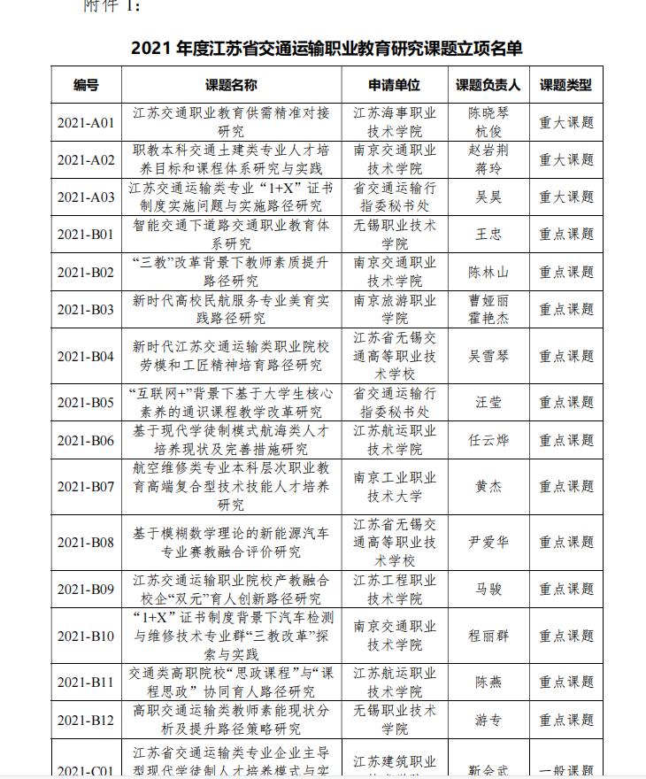 5月20日,江苏省交通运输行指委印发《关于开展 2021 年度江苏 省交通运输职业教育研究课题申报的通知》,公布2021年度江苏省交通运输职业教育研究课题立项,吴雪琴教授负责的课题《新时代江苏交通运输类职业院校 劳模和工匠精神培育路径研究》获批立项。