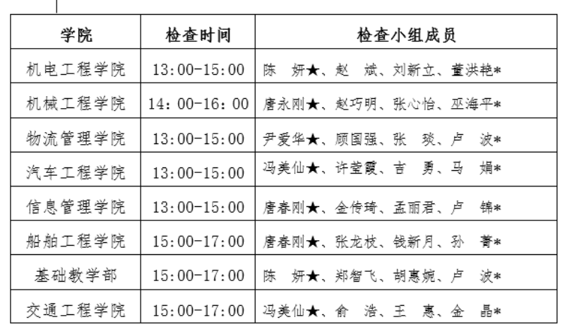 1.检查时间安排:1月11-12日教研室自查、院(部)抽查;1月13日学校检查。学校检查日程安排如下:
