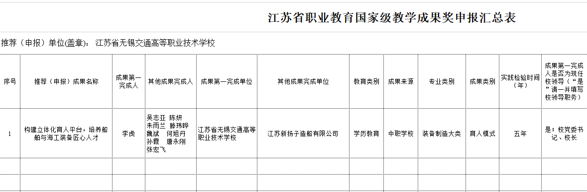 根据《江苏省教育厅关于做好2022年职业教育国家级教学成果奖申报推荐工作的通知》(苏教职函〔2022〕37号)精神,按照公开、公正、公平的原则,经成果完成人申报、教务处审核,现将拟推荐项目予以公示。