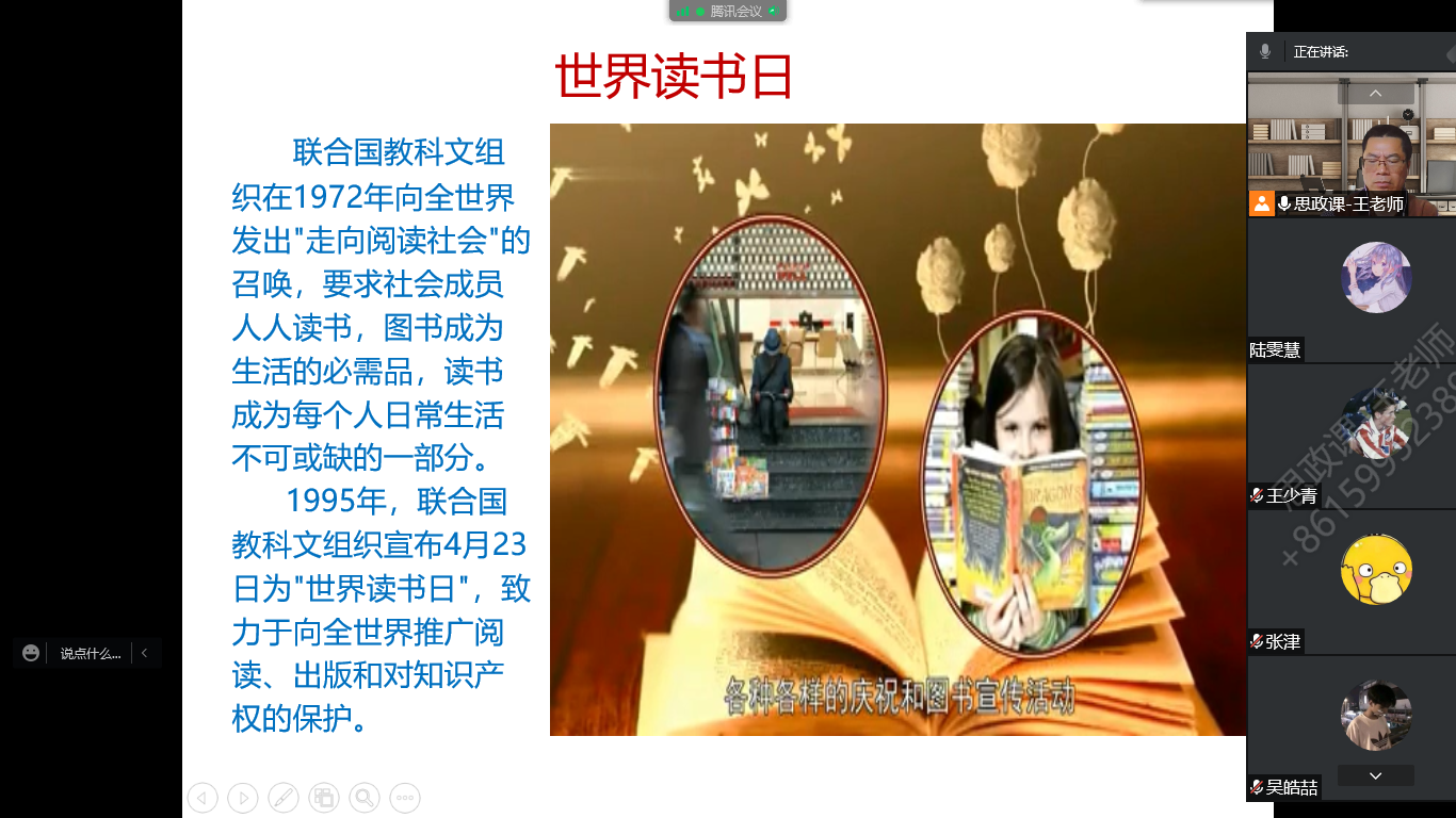 最后,王老师在线上与社团成员一起交流了读书的方法与心得,并且希望社团成员们能够趁年轻时多读书、读好书,养成爱读书的好习惯,不仅在“世界读书日”要读书,而且应该把读书的好习惯融入到生活中的每一天!