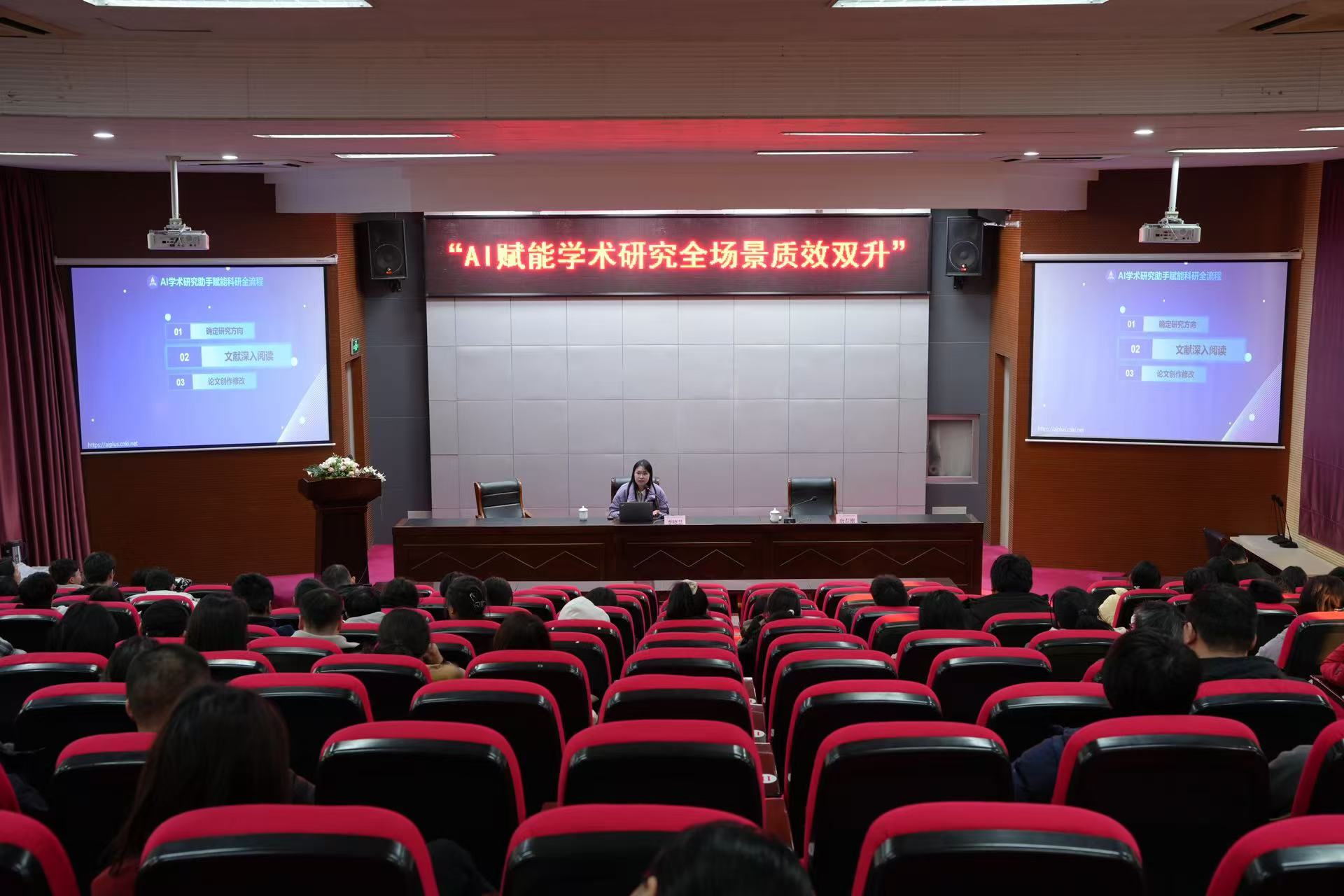 为响应新时代学术挑战,提升教师的教科研效率与质量,拓展学生对人工智能(AI)的认识,我校教务处联合科研处和图文信息中心,于12月18日在学术报告厅举办了“AI赋能学术研究全场景质效双升”专题讲座。讲座邀请中国知网资深培训讲师李晓慧女士主讲,教务处副处长唐春刚主持。